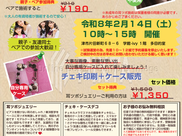 学館-ivyの日常 2026.01.30 ミニョンでこ(生徒運営事業) 記事のタイトルとURLをコピーする 昨年12月頭頃から、起業家教育を開始しました。 今回は、志望する高校生と大学生で運営・企画を実施し、 事業としてどのように進めるかとの思考力の強化に務めました。 2月14日土曜日の10時~15時まで ・耳ツボジュエリー体験(施術は有資格者) ・スマホの画像をチェキ化しケースや落書きができる体験 の二種類のサービスを実施いたします。 何卒、よろしくお願いいたします。 栗田武典 学館-ivyの代表者。子供達が将来を考え目標の達成ができるように、精一杯の指導と対応を行います。 https://gakukanivy.com Instagram X Contact Post Share Hatena Pocket RSS feedly Pin it 投稿者: 栗田武典 学館-ivyの日常 コメント: 0